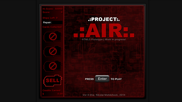 'Project .:AIR:.' is an arcade-style endless top-down shooter that features a mix-and-match upgrade system, allowing players to pick and choose combinations of perks like extra firepower, missiles, homing projectiles, and more. Assemble your fighter from a selection of wings, tails, and engines to customize your look and soar over the battlefield, shooting down enemy aircraft and hover tanks. Sell unwanted upgrades to repair you ship, because once it takes too much damage, it's the end of your run.